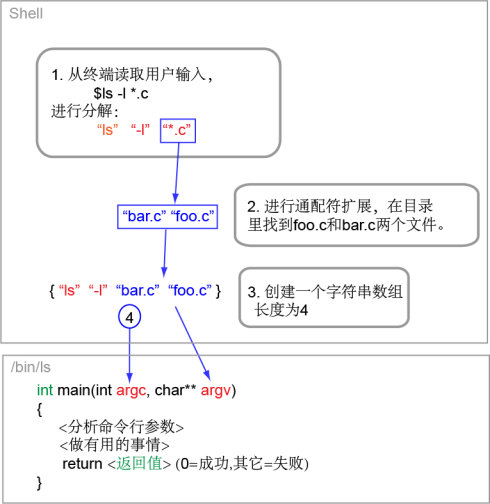 这三条原则当中,前两条其实早于 Unix 就已经存在,它们描述的其实是程序设计最基本的原则 -- 模块化原则。任何一个具有函数和调用的程序语言都具有这两条原则。简言之,第一条针对函数,第二条针对调用。所谓"程序",其实是一个叫 "main" 的函数(详见下文)。 所以只有第三条(用文本流做接口)是 Unix 所特有的。下文的"Unix哲学"如果不加修饰,就特指这第三条原则。但是许多的事实已经显示出,这第三条原则其实包含了实质性的错误。它不但一直在给我们制造无需有的问题,并且在很大程度上破坏前两条原则的实施。然而,这条原则却被很多人奉为神圣。许多程序员在他们自己的程序和协议里大量的使用文本流来表示数据,引发了各种头痛的问题,却对此视而不见。 Linux 有它优于 Unix 的革新之处,但是我们必须看到,它其实还是继承了 Unix 的这条哲学。Linux 系统的命令行,配置文件,各种工具之间都通过非标准化的文本流传递数据。这造成了信息格式的不一致和程序间协作的困难。然而,我这样说并不等于 Windows 或者 Mac 就做得好很多,虽然它们对此有所改进。实际上,几乎所有常见的操作系统都受到 Unix 哲学潜移默化的影响,以至于它们身上或多或少都存在它的阴影。 Unix 哲学的影响是多方面的。从命令行到程序语言,到数据库,Web…… 计算机和网络系统的方方面面无不显示出它的影子。在这里,我会把众多的问题与它们的根源 -- Unix哲学相关联。现在我就从最简单的命令行开始吧,希望你能从这些最简单例子里看到 Unix 执行命令的过程,以及其中存在的问题。(文本流的实质就是字符串,所以在下文里这两个名词通用) 一个 Linux 命令运行的基本过程 几乎每个 Linux 用户都为它的命令行困惑过。很多人(包括我在内)用了好几年 Linux 也没有完全的掌握命令行的用法。虽然看文档看书以为都看透了,到时候还是会出现莫名其妙的问题,有时甚至会耗费大半天的时间在上面。其实如果看透了命令行的本质,你就会发现很多问题其实不是用户的错。Linux 遗传了 Unix 的"哲学",用文本流来表示数据和参数,才导致了命令行难学难用。 我们首先来分析一下 Linux 命令行的工作原理吧。下图是一个很简单的Linux命令运行的过程。当然这不是全过程,但是更具体的细节跟我现在要说的主题无关。 从上图我们可以看到,在 ls 命令运行的整个过程中,发生了如下的事情: