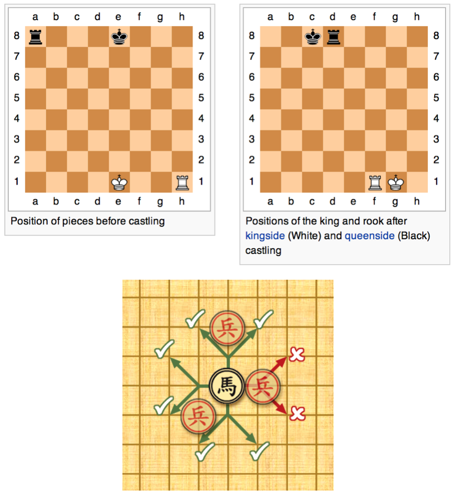 另外换位的时候王和车不是直接互换位置那么简单,而是这样的路线: 一条这样的特殊规则就够伤脑筋了,据我所知国际象棋还有至少其它两条类似的规则。它们跟其他的规则组合在一起的时候就产生了组合爆炸效应,你发现每走一步,甚至貌似无关的动作都得检查它们是否会出现。你不得不随时把这么复杂的规则放在脑子里。没事找事也不要找这么麻烦的事啊。 这些规则就像是要你记住 C 语言里的 ++i+i++ 或者 if (x = "foo") {...} 是什么意思。经过多年的痛苦经历之后,你多希望不再需要理解这样的代码。可是一旦这样的规则被加到语言里面,总会有人为了显示自己的水平和记忆力去用它们。不得已,你只好陪他们玩。 如果你觉得多了这些无厘头的规则会让国际象棋比中国象棋难度大或者更加有趣,那你就低估了中国象棋了。中国象棋的“游戏树复杂度”其实比国际象棋还要高,高达 10150,而国际象棋只有 10123。这跟中国象棋的棋盘要稍微大点有关系,但是总比记忆那些麻烦的规则好多了。所以相对来说中国象棋既简单又耐玩。 如果国际象棋还凑合算是简单的话,大部分的程序语言就像是魔鬼棋,飞行棋,或者三国杀。它们几乎完全由类似的特殊规则构成。哇,那么多的人物,道具和特殊技,好玩!可是会玩象棋或者国际象棋的人都会觉得它们无聊透顶。 那么是不是规则越简单越少的棋越好呢?围棋就比中国象棋还简单,那么围棋是不是更好玩呢?我觉得不是的。围棋对我来说太慢,太单调,棋盘太大,耗时太多,而且胜负居然不能一眼就看出来,要数好一会儿!这哪里是在玩,纯粹就是在做组合优化题嘛。我觉得这种任务适合交给电脑去做。所以其实简单也有一个界限,超过了这个界限对于人就没有很大区别了,反而会开始感觉缺少一些东西。 我觉得中国象棋和围棋一样简单,它的规则虽然比围棋多,但是仍然处于人脑容易记忆的范围,而且每条规则都很直接了当,没有很隐晦的条件。中国象棋的长距离武器(车和炮)让它比围棋多了很多乐趣,而对于象,马和王的走法的限制,让它比起国际象棋多了几分安心和舒适。国际象棋的后,两个车,两个相的攻击距离和范围太大,让人觉得眼睛很辛苦,因为每一个位置都可能被从太多个方向远距离攻击。而那个王,由于可以到处乱跑,以至于你感觉不是在抓一个住在戒备森严的城堡里的人,而是一只在野外乱跑的老鼠。 什么游戏会让人觉得有趣,真是一个值得研究的问题。我觉得象棋和我以前推荐过的一个游戏 Braid 里面含有同一种吸引人的设计:屈指可数但又有足够变化的简单规则,组合起来制造出许许多多的变化。这种特征其实也是鉴别一个优秀的程序语言的标准。 程序语言与音乐程序语言就像音乐。当听过很好的音乐之后,你会自然而然的厌倦以前曾经喜欢过,为之疯狂过的那些,觉得它们很无趣,甚至很惊讶自己以前怎么会喜欢它们。当有人问你为什么不喜欢他们推荐给你的音乐,你却说不出来。你只是自然而然觉得太单调,不入耳,不对劲,甚至扰乱你美好的心情。你的判断完全是依靠声波对鼓膜的震动而引起的脑电波的起伏,而不带有任何的成见。完全根据这音乐自己,而不需要知道它的作者是谁。就像玩过像《Braid》之类的游戏之后,你再也不想玩像《生化危机》那种搞不清楚到底是自己在玩游戏还是游戏在玩自己的。你的脑子里有一种对“趣味”的新定义,但是你却说不出来它到底是怎么回事。 程序语言是同样的感觉,这是一个“流行语言”招摇过市的年代。每当有人问我喜欢什么程序语言我都不好跟他说,因为一旦说出来就有显摆之嫌,而其实真正显摆的是其他人。很多人期望你的回答是他所膜拜的那个最近很热门的语言,你一旦告诉他你喜欢的语言就会被冷嘲热讽,因为你的语言不热门。他们会说你是“学院派”,而他们是“工程派”,而其实这只是给垃圾的存在找借口。他们利用你害怕自己被认为是附庸风雅或者居高临下的心理来变相地压制你,让你不敢直率的袒露自己的兴趣。你不敢显示对有些东西的不屑,而他们却可以任意的显示对真正优秀的技术的不屑。你觉得应该手下留情一些,谦虚一些,结果最后一些垃圾一样的语言就骑到你头上来,让你不得不用它们。 用过很好的语言,然后自己设计过程序语言之后,我再也不对很多新的语言,或者有些人很崇拜的古老的语言感兴趣了。我完全是凭自己的感觉来判断,一些所谓的“新特性”其实是老酒换新瓶,或者是勾兑的假酒。程序语言本来就只有那么点东西,为什么有人仍然像对那些扮相的流行歌手一样热衷和疯狂。 我知道这些话说了也白说,因为他们没有用过我用过的语言,他们只看到名字却感觉不到本质,他们靠别人的评价来判断,而不是靠自己的心。所以像音乐一样,只有等有一天他们忽然觉悟,就像很多年前的我一样。 程序语言与武器前段时间 AK-47 的设计者 Kalashnikov 去世的时候,我从一篇文章了解到他设计 AK-47 的故事,发现 AK 跟我喜欢的程序语言设计有异曲同工之妙。