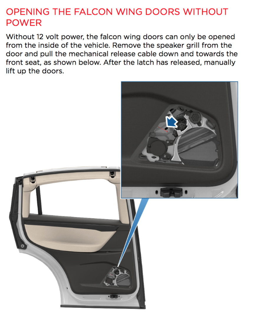 Tesla Model X的车门设计问题Tesla即将推出的SUV(Model X),不但继承了以上提到的Model S的各种问题(触摸屏,门把,……),而且还制造了新的问题。Model X具有一个别出心裁的车门设计,这车子看起来像一只展翅的鸟: 这样开的车门貌似更省空间,方便在狭窄的地方开门,而且看起来更酷,有点像McLaren或者Lamborghini。然而这样的设计,在我看来有以下几个问题: 安全性问题由于后门完全由电机控制,在车子失去电力的时候要打开后门,过程复杂得离谱。首先在失去电力的时候,无论如何是不可能在车外把门打开的。这意味着,如果出车祸着火了,消防队员可能没法很快帮你打开车门。 如果你运气好,没有受伤,头脑还清醒,气囊和安全带也没挡住你,那么你必须完成三件复杂的操作,才能逃离Model X: