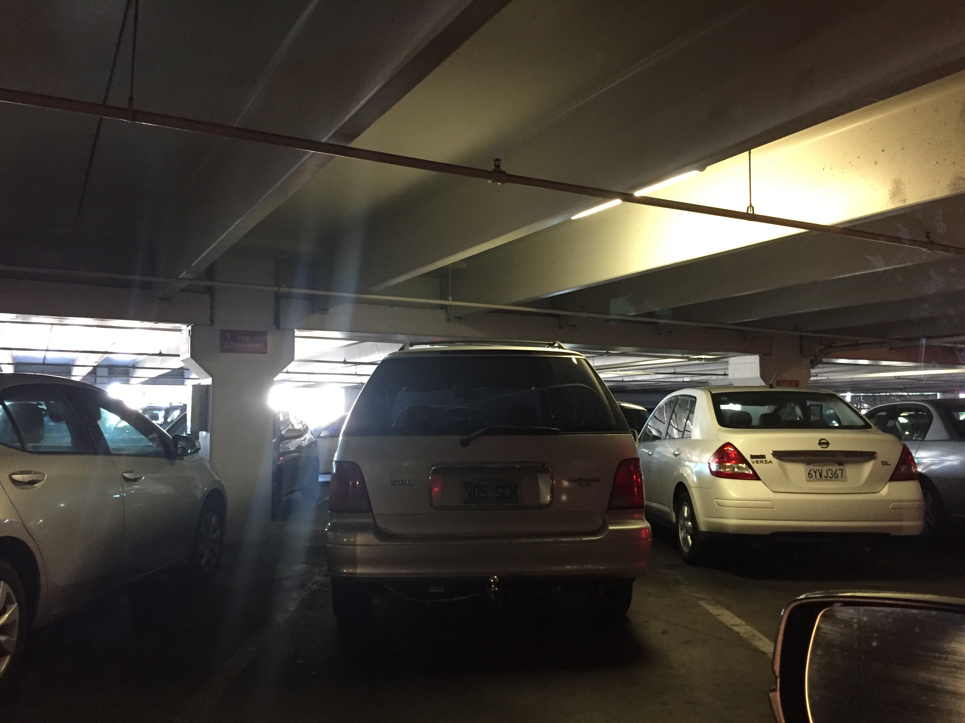 趴车的麻烦在顶棚很低的车库里可能会碰到天花板。这是一个很现实的问题,因为很多车库旁边的空间很多,顶棚却很低。比如,这次我到洛杉矶和拉斯维加斯旅游,经常遇到这样的车库: 总的说来,在非常狭窄的地方开门,其实并不是什么很需要解决的事情。有钱买Model X的人,难道会经常把车停在狭窄的夹缝里吗?为了这种不常见的应用,用得着花这么大功夫设计个车门吗?就算你能开门,人出去之后挤不挤得出去,是另外一回事。如果地方实在太窄,你完全可以让后面的人先下车,然后再进车位。 另外,滑动式的车门同样可以解决这个问题,根本用不着花大成本来实现升起来的车门。 如果你知道,Model X的车身宽度为81.6英寸,比Hummer H2, Cadillac Escalade和Ford F-150这样的庞然大物还要宽,你就会发现真正的问题不在于空间不够,而是在于这车实在太宽了。有多少人愿意开这么宽的车,是一个问题。 实用性问题