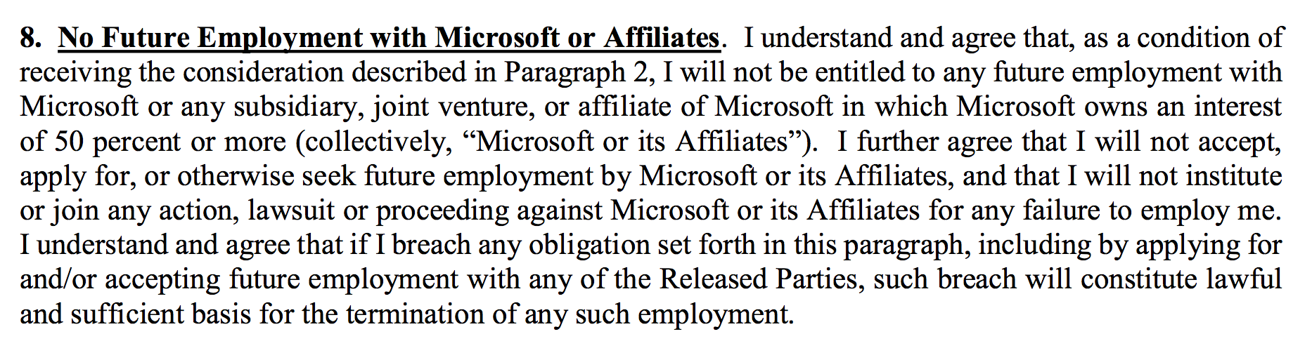 微软的秘密离职协议(旧)我与微软的对峙,终于以我的“有条件离职”而告终,现在微软把事情弄得相当丑陋。有条件的意思是,微软必须满足我的条件,我才会签字表示“自愿离职”。看来微软真是目光短浅的公司,宁愿放弃优秀的人才和极其可靠的代码,也不愿意给人合理的报酬和职称。或者也许我的代码写得实在太清晰了,所以他们觉得不需要我就可以搞定一切吧,那我祝他们好运了。 由于入职的时间不够一年(7 月份到一年),按照 offer letter,如果我“自愿离职”,微软就有权收回入职时给我的“sign-on bonus”,价值 2 万 5 千美元。在我看来,这个 sign-on bonus 根本不应该退。微软在谈工资的时候,一直把这个 sign-on bonus 和其它 bonus 算在我“第一年的收入”上面,以此来说服我他们给的工资还算合理,直到给 offer letter 的时候才说这个是不满一年要退的。 我这几个月日夜辛劳,付出的额外工作时间的价值,已经远远超过 sign-on bonus 的数额,更不要说我放弃了今年的 performance bonus,而且我已经工作了 9 个月,所以就算退也不应该全部退。因此,我对于“自愿离职”提出了一个很简单的条件,我要求微软放弃收回 sign-on bonus,这样我才会给他们签字,表示自愿离职。否则他们就必须通过其他手段开掉我,那样我也就不需要退他们 sign-on bonus。 结果他们“同意”了,然而却为此附加了许多的条件,把这些都写进了我的离职协议,要求我签字。这些条件非常的恶心,特别是第 8 条:从今以后我不得再加入微软,它的附属公司,以及微软股份超过 50% 的其它公司,如果加入了他们就有权赶我走。 很显然,我这辈子再也不会加入微软了。我要是成立了公司,也永远不会卖给微软。光是想到要用 Windows 工作,要和吹牛手段极高,写垃圾代码的印度阿三共事,我就不会再做这样的傻事了 :P 但这些应该是我说了算的,现在要我签这样的协议,永久的阻止我进入微软及其子公司,就是在严重侵犯我的合法权益和尊严,这不是明摆着在欺负人是什么?你们以为不停的收购其它公司,就可以把我饿死了?几个经验丰富的朋友看了这个条款,都说从来没见过任何公司使用这样的离职条款,这是非常险恶的霸王条款。 另外,协议还要求我不能鄙视和嘲笑微软,不能协助现在,过去或者将来的微软员工,对公司提出抱怨或者顾虑,承认微软没有犯任何错误,不得用任何原因起诉微软,等等。 当然,我严词拒绝了签这个协议。我对他们说:“这个协议要我放弃如此多的法定权益,我不能签,给我再多钱也不能签!我完全可以算是放假,等到 7 月满一年的时候再离职,就不需要还你们 sign-on bonus 了。” 然而 HR 回话说:“你的 email 里面已经说你要离职,我们已经同意了,所以等到 7 月不再是一个选择。” 呵呵,从来没有听说自愿离职可以发个 email,不用签字的。另外,我的 email 里面说的其实是:“如果你们同意不收回 sign-on bonus,我就离职。” 这是有条件的,微软并没有“无条件满足”我的条件,而是在此之上又提出了极其恶毒的条件。我不能接受这些条件,所以我也就不会主动离职。看清楚这里的逻辑了吗?后来,我就发现 HR 开始肆意歪曲我的话,想强迫造成一种我已经主动离职的假象,这样他们就可以利用这个 sign-on bonus 的问题,来逼迫我签这个恶心的协议。 与微软 HR 和上司们的谈话,从我面试的时候开始就已经充满了谎言和欺诈,各种不爽。撒谎找借口压低职称和工资。号称六个月升职,却完全没有动静。上司们为了树立威信,对自己的经历和成就进行夸大。故意不让我和其它团队面试。各种讨价还价贬低人的价值。在 offer letter 上做文章。再加上入职后的各种奇葩经历,超时工作,各种变相的不尊重…… 这一切都让我恶心而厌倦。要不是我早已经决定在美国只看最后一个大公司,我是肯定不会加入微软的。 我曾经一度讨厌微软和 Windows,后来却由于很多人说微软的好话,说他们尊重人才,说 Windows 其实改进了很多了,微软不再是以前的微软,才将信将疑的决定去试试。今天我终于明白了,微软始终没有变过,它一直是那个邪恶的霸王公司。即使现在风光不再,它的本质从来没有变过。它的 Windows 和其它软件的质量,也从来没有变过。看起来有一些好的想法,然而它们的实现,全都糟蹋在水平低劣的印度廉价劳动力手中,糟蹋在他们的各种勾心斗角和政治斗争中了。这就是为什么微软的东西那么难用,问题那么多,出了问题还不知道怎么回事。你可能以为微软是大公司,很多事情应该大度不计较,然而微软 HR 和 recruiter 对各种事情的处理方式,其实比起小的 startup 还要不规范,各种抠门,威逼欺诈,隐藏信息,甚至肆意歪曲。微软不能靠自己的魅力留住人才,就想方设法设置各种讨厌的限制,想以此阻碍人才的流失。 虽然这个离职协议的内容包含了“保密”条款,要我不得向其他人透露协议的内容,然而由于我没有签字,所以这个协议没有法律效力,我也没有必要为他们保密。我有权把协议的内容公之于众,以警世人。很多人也许还没见过微软的离职协议吧?因为签了的人就不能再分享它。我没有签字,所以现在大家可以见识一下了。很多人还以为微软是一个仁慈的雇主…… 我要告诫大家,如果有协议让你放弃如此多的合法权益,请不要为了一点钱就签它。这不只会祸害你自己,还会伤害其他跟你同样经历的人! 你可以在这里下载这个离职协议的