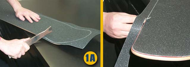 注意了,下面就是业界机密啦!用锉刀沿着板子边沿刮一圈,把边沿上的沙挂下来,这样使你以后割掉多余的防滑沙的时候容易的多,而且使沙的边沿非常完美(如图1A)。^_^