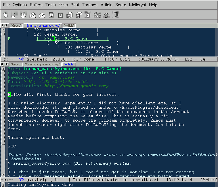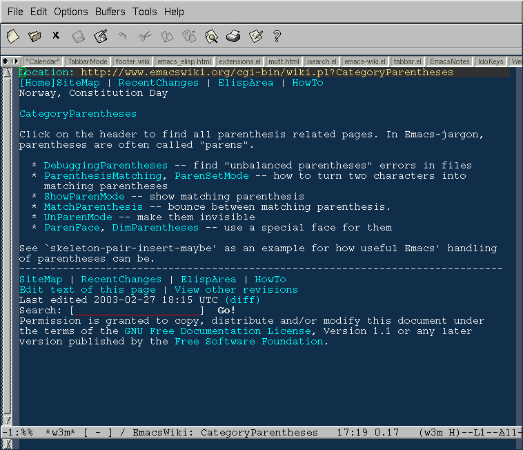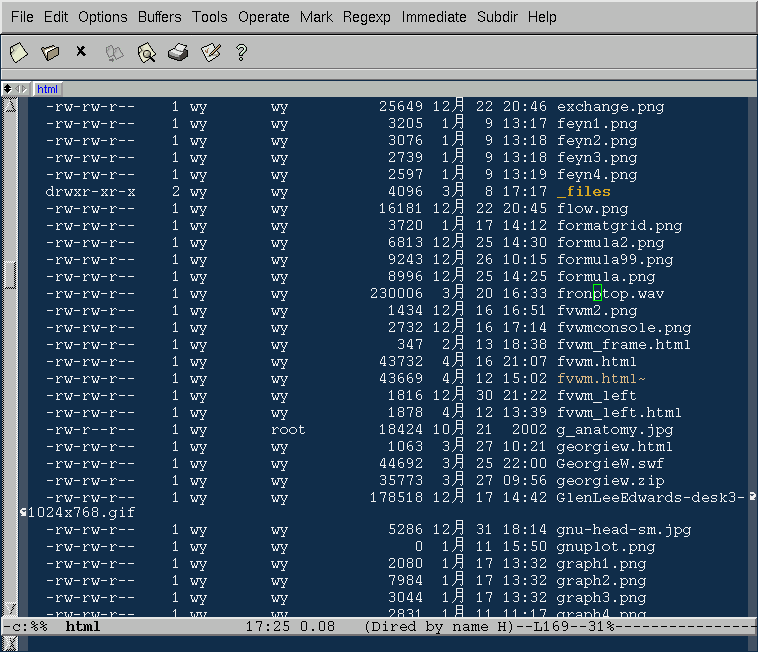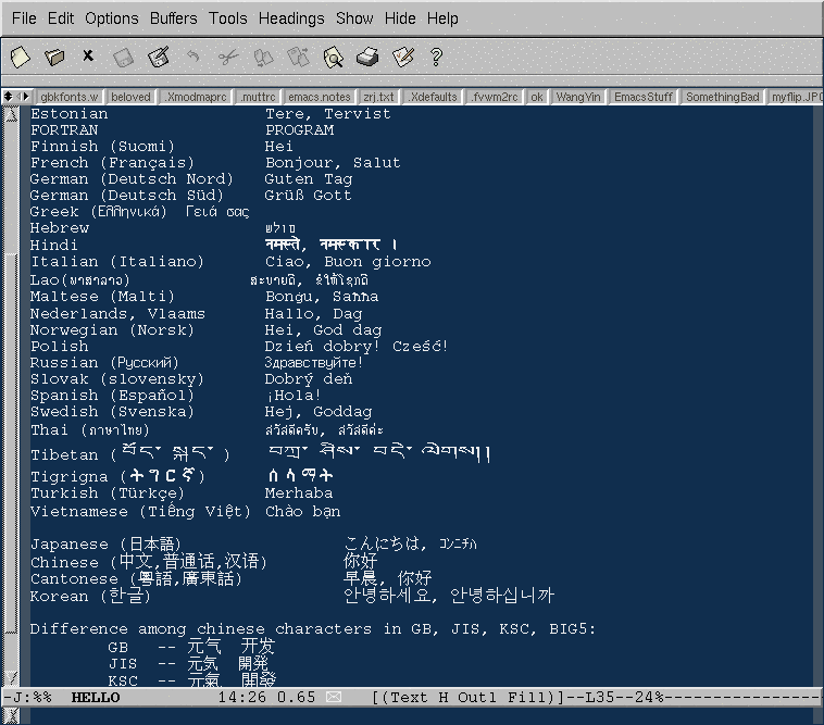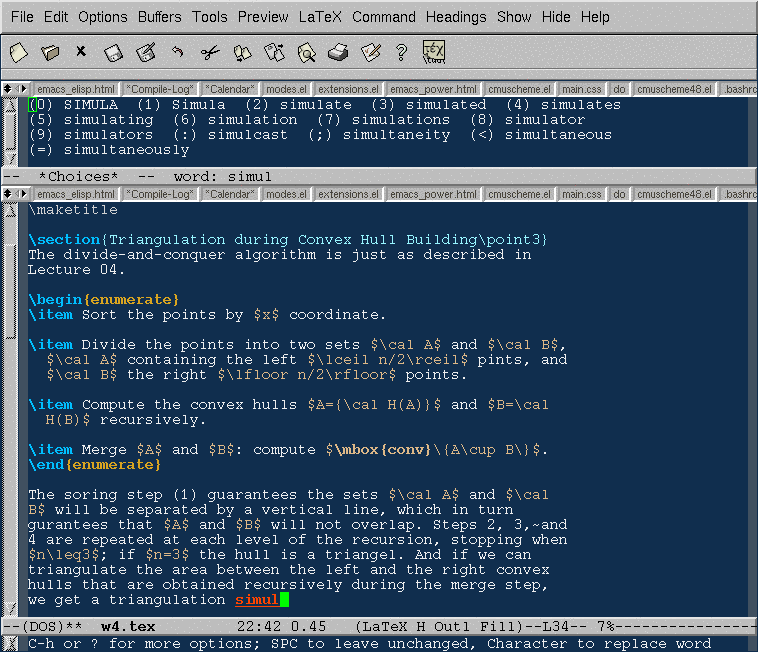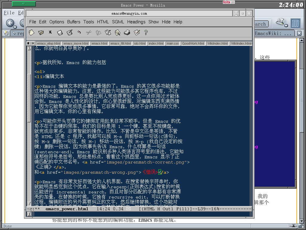 我只要按 M-q 就可以把一段话排的规规矩矩。我只要按一个键就 可以把一个数字列表重新排序。我只要在 HTML 文档里按 C-c backspace 就可以把一组tag删掉,按C-c C-c i 就可以插入一个图 片,按 C-c C-v 就可以马上把这个文档送到一个 Mozilla 窗口去预 览……在 LaTeX 文档里按 C-c C-r RET 就可以把我的文档里选定的 区域送给 LaTeX 处理,马上看到效果。