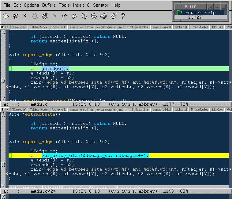 你可以使用 Ediff 来比较两个或者三个文件,Emacs 可以把不同 的地方高量,而且修改过的地方有特别明显的颜色不同。我经常用这 个功能很快找到我修改过的代码里新出现的错误的位置。看看这个抓图。