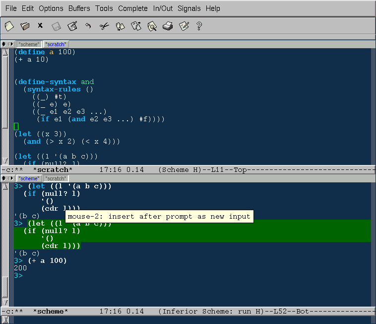 Emacs 可以作为很多程序的前端。比如w3m, lynx 浏览器,MAXIMA 计算机代数系统, Scheme48 等 Scheme 解释器,shell,……这些文本方式的程序一旦 与 Emacs 接合就拥有了巨大的编辑的能力。看看这幅图,Scheme48 加上 Emacs,就有了语法加亮和方便的热键,可以非常方便的使用Scheme 解释器了。