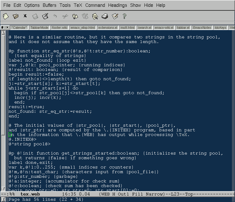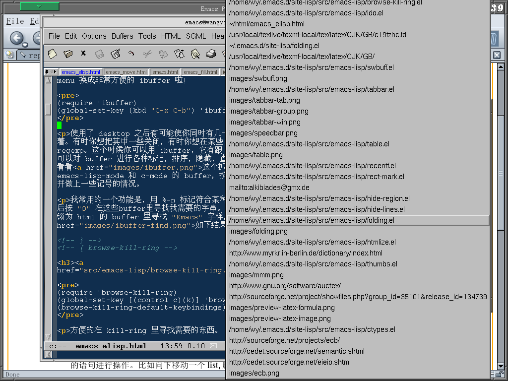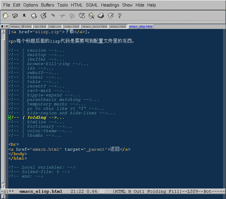 Emacs 的 narrow 和 folding 功能使你能够编辑几万行代码在一 个文件里而不会觉得摸不着方向。看看这幅图,你能想像这是 TeX 的源代 码的 24000 多行里的一部分吗?你操作它的时候就像只有几十行。 folding 可以使你的很长的文档折叠起来,看看这幅图就是我的一个很长的网页, 我在需要的时候可以进入其中一个主题进行编辑,当我退出主题时, 整个文档看起来就像只有一页那么长。我可以随意的移动我的主题, 就像只移动了一行。