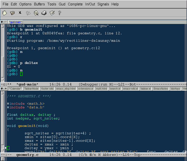 你用一个指头就可以让 Emacs 调用编译器编译程序,列出错误列 表,启动调试器,在另一个窗口显示当前执行源代码的位置。看看这 个抓图就是 emacs 正在调用 gdb 调试程序。