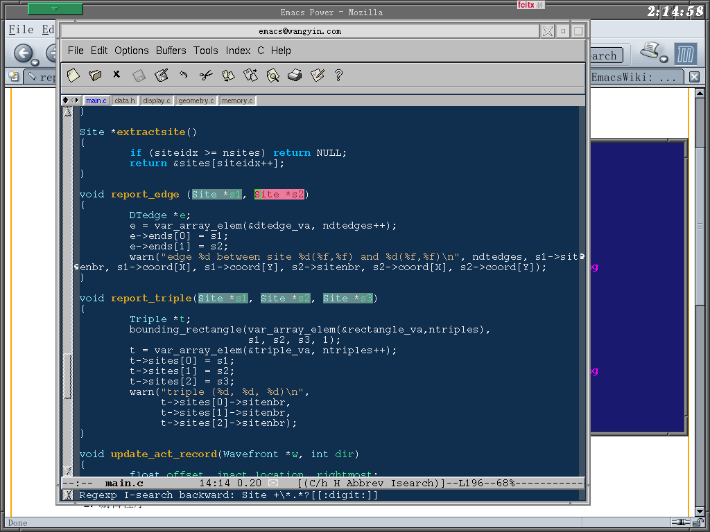 Emacs 有非常友好而强大的人机界面。在搜索替换字符串时,你 就能明显感觉到这个优点。它在输入regexp(正则表达式)搜索的时候 还能进行 incremental search,而且对部分匹配的字串都有非常漂 亮的加量。在替换的时候,它独有 recursive edit,可以打断替换 过程,编辑附近的需要纠正的文字,然后继续替换。这个功能对很多 人都是非常重要的,因为,在替换过程中,被替换的文字附近的文字 很可能会因为它被替换而需要修改。看看这个抓图,就是 isearch 输入一个正 则表达式的情况。