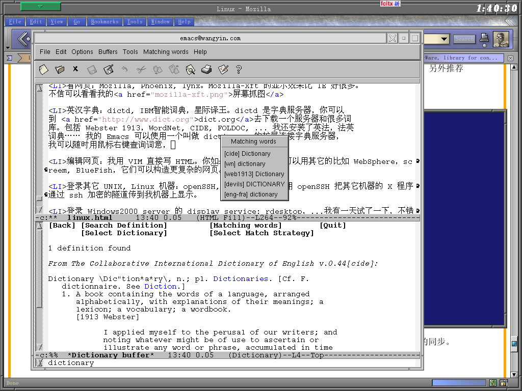 我的 Emacs 可以使用一个叫做 dictionary 的扩展连接字典服务