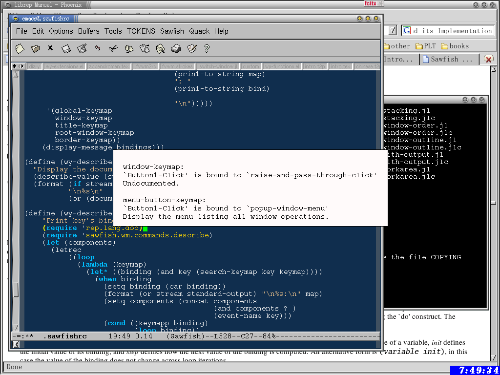 Sawfish 很像 Emacs,它的配置语言非常像(实际上就是) elisp,不 过它也可以使用 Scheme 的 lexical binding 和 first class continuation. 你可以看到我在后面有一个例子里使用了Scheme 的 closure。
