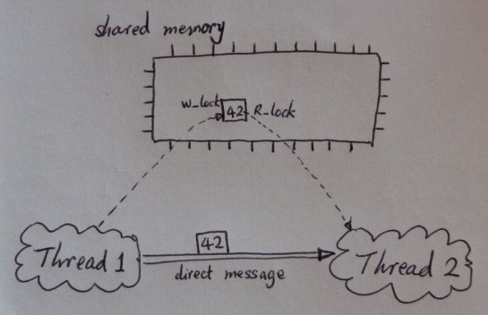 Shared Memory Mutliprocessing Is An IllusionBelieve it or not, shared memory multiprocessing systems dont really exist. This may sound crazy, but I hope you see what I mean. Uncontrolled access to shared memory contents led to chaos, thus in the past several decades, various synchronization mechanisms have been devised. However, all the mechanisms that we have seen so far have very ad-hoc semantics and are notoriously hard to use. Operating systems books usually present the classical synchronization problems and their standard solutions as they are, but never explain how somebody could ever arrive at the solutions systematically. The secret is that nobody really knows a systematic way. The current state-of-the-art in shared memory programming is that race conditions, deadlocks, are still hampering even the worlds best programmers. My understanding is that, if you happen to get it right, those synchronization mechanisms (subconsciously) serve the same and one purpose: to simulate a message passing system. Shared memory segments serve as message buffers, and synchronizations establish communication channels. Reads and writes of memory locations correspond to receives and sends of messages. For any channel and at any time, information flows in only one direction. This equivalence can be depicted in the above picture. So semantically speaking, every correct shared memory program is essentially a message passing program. Shared memory multiprocessing is an illusion, hiding the message passing (or transactional) nature of concurrent computation. It is helpful to think of a shared memory system as a particular implementation of a message passing system even if we have to write shared memory programs. |
