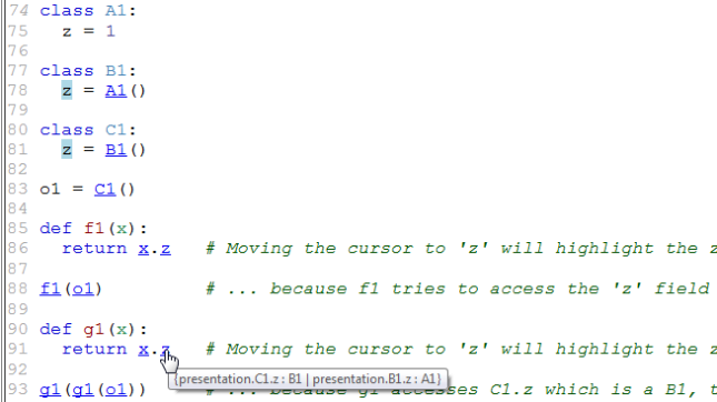 PySonar can build code indexes that respects scopes and types. Because it performs inter-procedural analysis, it is often able to find the definitions of attributes inside function parameters. This works across functions, classes and modules. The following image shows that it can accurately locate the field x.z