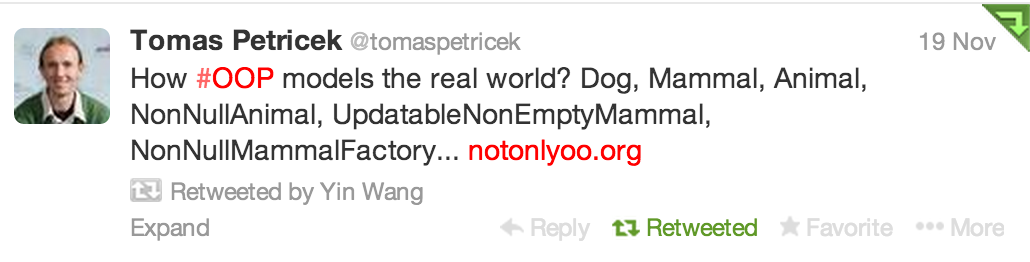 On object-oriented programming[written at the end of 2013 AD, during the Dark Ages of programming] The programmer's world is full of fads and superstitions. Every now and then there will be somebody who come up and announce: "I can save the world!" No matter how bad the ideas are, there will always be followers, and the ideas soon become their religion. They then develop their community or camp, try to let those ideas dominate the world, and try to make the ideas live forever. Object-oriented programming (OOP) is such a religion. It claimed to be able to save the world from the so-called "software crisis", but as a hindsight after so many years since it was introduced, not only didn't OOP save us, it brought us way more confusion and harm than benefits. Unfortunately its dogmas and mispractices have become so wide-spread and deeply intrenched. In this article, I hope to provide my viewpoint into this matter and try to find out the lessons that we can learn. Like every article on my blog, the opinions are completely personal and not representing my employers or professors. Is everything an object?"Everything is an object" is the core dogma of OOP and deemed as the highest standards of OO language design. Now let's take a careful look to see if it is true, or if it is a good idea to make things that way. Many people take "everything is an object" for granted because when this sentence is taken literally it matches their everyday experience. Since the word "object" in English basically means "a thing", how can "everything is an object" be not true? But be careful since the definition of an "object" in OOP has a specific meaning which is very different from its meaning in English. OOP's definition of an object is "a combination of data fields and associated procedures known as methods". Can you really fit everything into this model? First let's look at the real world and see if this definition can capture everything. Cars, trees, animals may sometimes be thought of as objects, but what about a change of the objects' position, its velocity and duration? What methods do they have? Well, you may define classes called Velocity or Time, with methods such as addition, but do velocity and time really contain the things that you call "methods"? They don't. They are just your imagination. You can add the velocities or time, but how can velocities or time contain the addition procedure? This is like saying that the bullets contain the gun. So the most you can say is that "everything is an object" is a good way of thinking, but that is not true either. The definition of an object implies that a method can only belong to one object, but most of the time it doesn't make sense thinking of it as belonging to any object. Say we have the expression 1+2, does the operator '+' belong to 1, or does it belong to 2? You have to make some arbitrary choice. Since you can make a choice, this means that the '+' operator doesn't really belong to either of them. The operation is inherently outside of the objects. So thinking of some things as objects may be helpful, but thinking of everything as an object is neither true nor useful. Unfortunately "everything is an object" has been taken as a dogma and the highest standard of OO language design. Some OO languages claim that everything is an object in them. Whenever you notice that something is not an object, somebody will try to make it one. They may succeed in that, but things get very complicated that way, because that's not how things work. The idealism of "everything is an object" is similar to "everything is a function" in the functional programming world and "everything is a set" in the math world. Before computer science was conceived there was a thing called the lambda calculus. Some people encoded everything including numbers and their operations, various data structures and control structures, ... all in lambdas. One of the encodings of numbers is called the Church numeral. Every programming language researcher has played with them during their education. But unlike "everything is an object", "everything is a function" has never become a dogma or marketing phrase. Those formulations sometimes provide thought experiments and inspirations to the researchers but nobody really use them for actual computation, because they are inefficient and they are not really how things work. They are just approximations (models) to some essence of computation that we can't see. If you really use them for practical projects, things become complicated. Mathematicians have a similar concept: set theory. Some geniuses encoded everything --- numbers, operations on numbers, mathematical structures, ... all in sets. Everything is just sets containing sets containing sets and so on. What's the problem? But when they really tried to do their proofs using those sets, the proofs fell under their own weights. They are too complicated. Even with the complexity, set theory is not expressive enough to capture whatever the mathematicians have to say. Many people tried to fix it, but they all failed. So "everything is an object" is in some sense on the same track of "everything is a function" and "everything is a set". Good thought exercise, but doesn't really work well in practice. I don't think that there is some "one true language". When compared to the "absolute truth" every theory is wrong, but some theories are more wrong than others. The model of OOP is too far from correct or practical. It's somewhat like the flat earth theory. Until today some people still believe that the earth is flat and make all kinds of theories to prove it. Some of their arguments look very scientific, but do you believe in their formulas or a picture of the earth from a spaceship? When you get the fundamental things wrong and don't throw them away, you have to patch them endlessly with even more complicated theories. You will have to make theories that bend the light and gravity in weird ways. And that's what ha